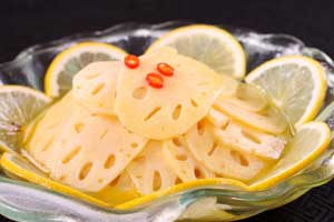 2:将糖、醋、盐倒入莲藕中拌入味,摆盘时可将一些辣椒圈撒在上面装饰即可。
