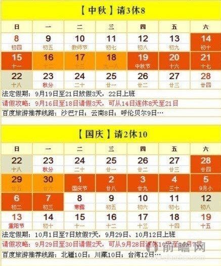 攻略三:请11天休24天!先按上面两种情况,申请中秋8天和国庆10天的假期,然后在9月22日-27日请假,共请假11天,即可享受“超值24天放假套餐”!