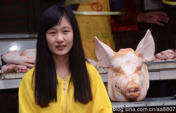 意外在兴安市场的武警安康支队对面,看到一位漂亮女大学生笑盈盈的,素面朝天不施粉黛,在肉铺里帮其父亲卖肉。她生得明眸皓齿秀发飘拂,身穿明黄色夹克衫、牛仔裤。那些猪头猪耳朵都刮得雪白,干干净净的。