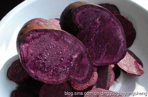 紫薯又叫黑薯,薯肉呈紫色至深紫色,目前在国际市场十分走俏。它含有丰富的蛋白质,18种易被人体消化吸收的氨基酸,维生素A、B、C等8种维生素和磷、铁等10多种天然矿物质元素。它是人体抗疲劳、补血的必要元素。与红薯一样,紫薯也含丰富的纤维素,可促进排毒,改善消化道环境,预防胃肠道疾病。