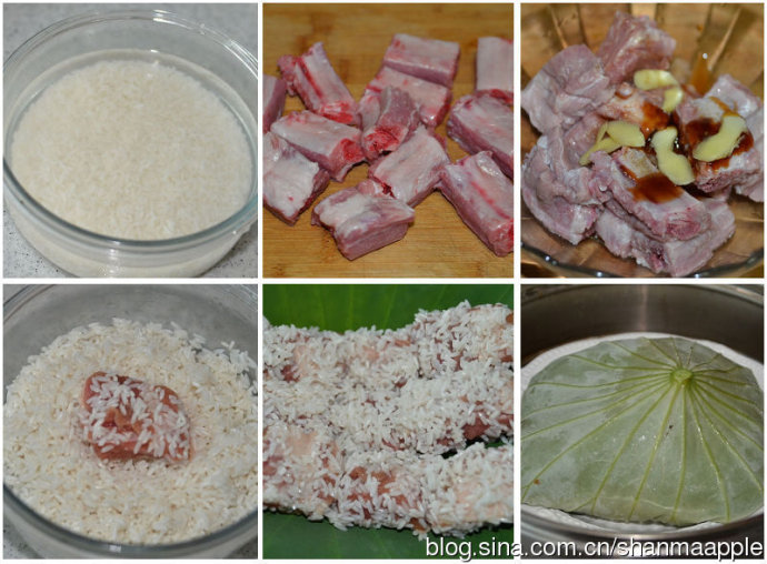 材料:肋排400克、糯米150克、荷叶、盐、生抽、蚝油、料酒、胡椒粉、姜