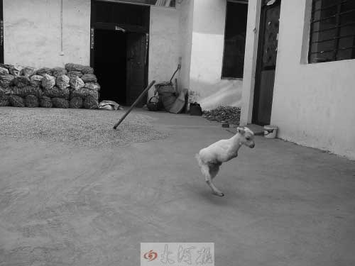 据羊的主人今年60多岁的赵大娘介绍,她家里饲养的一只母羊以前生出的小羊都很健全,可今年8月份,这只母羊产下4只小羊,其中一只却只有两条腿。一个月后,这只小羊开始慢慢学着用两条后腿行走。又过了一个月,这只小羊就会用它仅有的两条腿正常行走了。“我都60多岁了,这还是第一次看到只有两条腿的羊。”赵大娘说,乡里一名兽医曾经来看过,赵大娘询问为啥小羊生下只有两条腿,兽医称,有可能是基因变异所致。