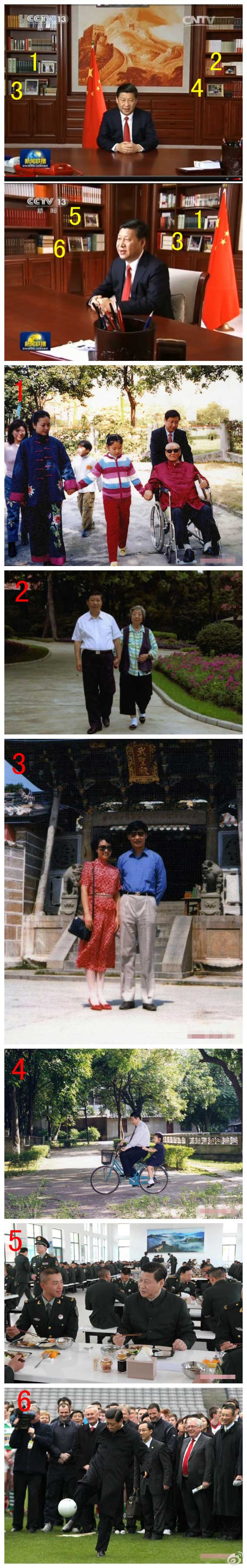 三个机位大体显示出了办公环境。画面中,习总书记办公桌后面以及侧面都是放满书籍的书柜,其中错落有致地摆放着6张照片,经过仔细辨认,这六张照片如下——