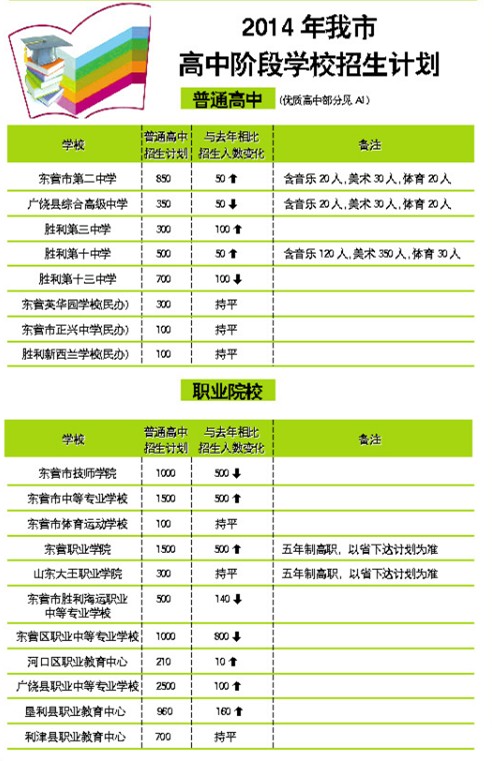 据悉,今年普通高中招生仍执行划片招生政策,16所普通高中计划招生14420人,招生对象为具有招生范围内户籍(或学籍)的初中应届毕业生。市教育局直属普通高中面向市直、东营区、东营经济技术开发区和济军生产基地中学招生。各县区所属普通高中面向所在行政区域招生。胜利教育管理中心所属普通高中面向所属初中学校招生。独立办学的民办普通高中可面向全市招生。