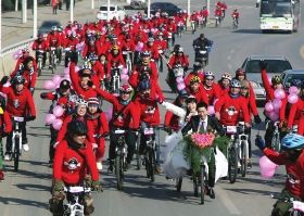 2013年1月1日是长沙市自行车旅游协会成员程敏大婚的日子。当天上午,他骑着新买的双人单车迎亲,同行的还有协会成员骑着99辆单车。长长的骑行队伍让这场婚礼成为一场自行车婚礼。